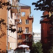 fontän. Husen ligger i två våningars sutteräng